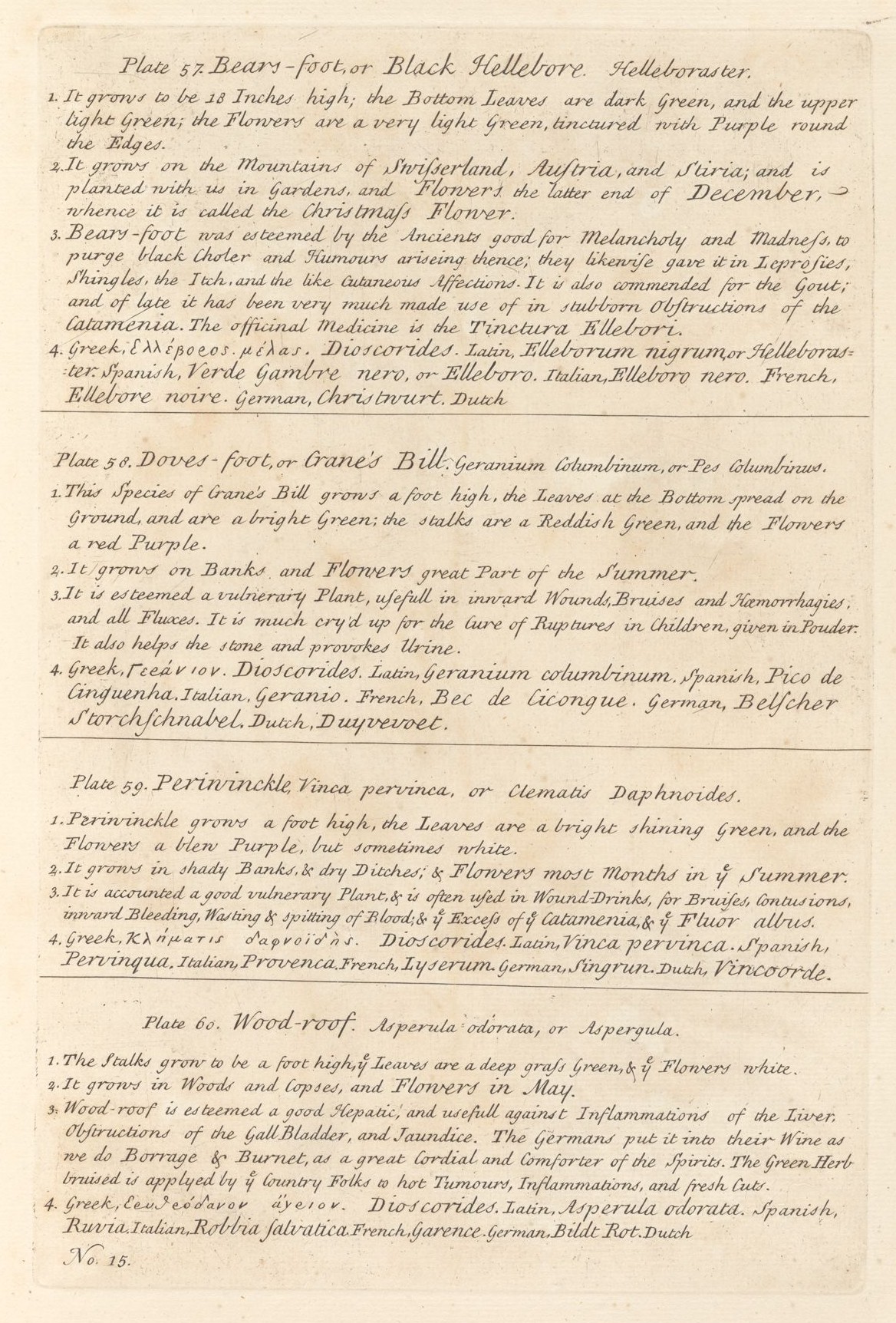 This is the text for the page 057-060 Bears-foot, Doves-foot, Periwinckle, Wood-roof in A Curious Herbal, Blackwell, 1739.