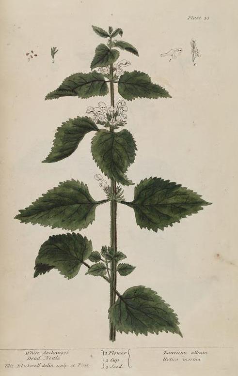 The text for this image is found on the page 033-036 White-Archangel, Woody Night-Shade, Broad-leaved Plantain, Borrage in A Curious Herbal, Elizabeth Blackwell, 1737 (Vol. 1), 1739 (Vol. 2).