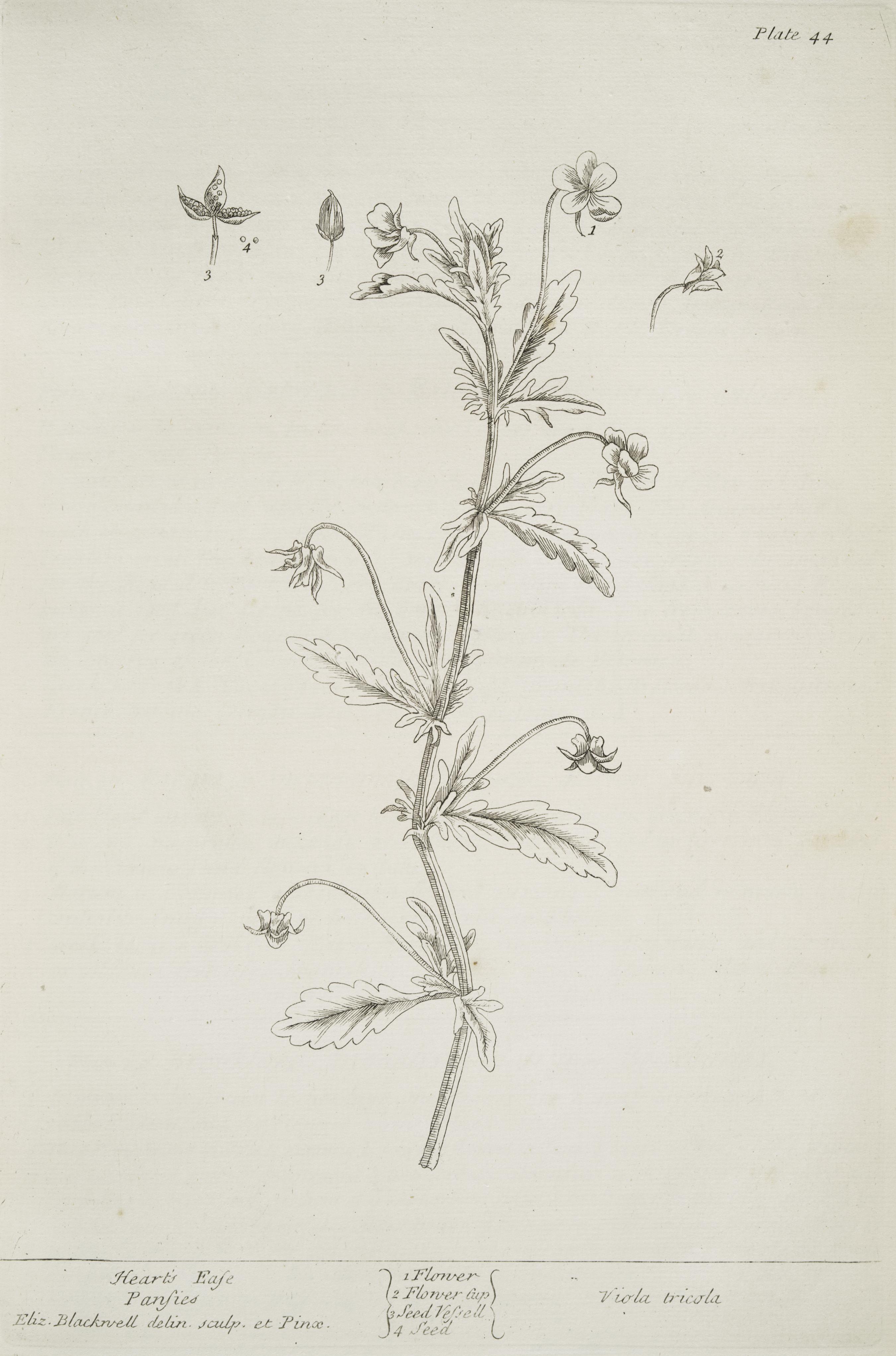 The text for this image is found on the page 041-044 Vervein, Ox-Eye-Daisy, Pimpernel, Pansies in A Curious Herbal, Elizabeth Blackwell, 1737 (Vol. 1), 1739 (Vol. 2).