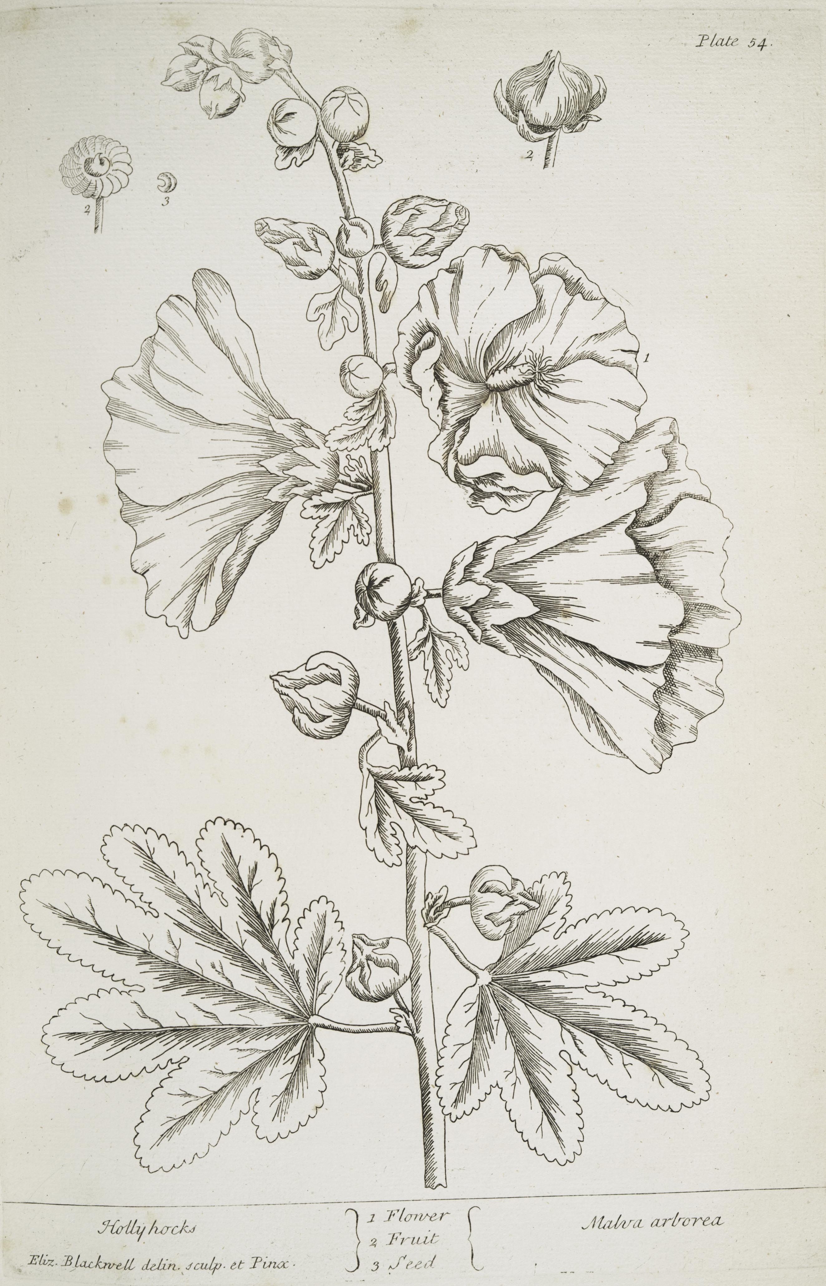 The text for this image is found on the page 053-056 Male Satyrion, Hollyhocks, March Violet, White Saxifrage in A Curious Herbal, Elizabeth Blackwell, 1737 (Vol. 1), 1739 (Vol. 2).