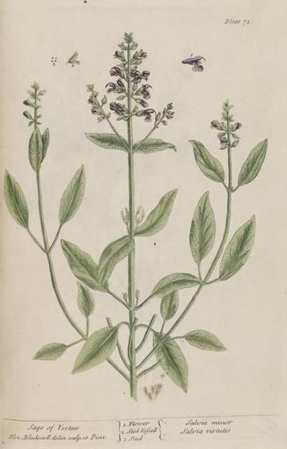 The text for this image is found on the page 069-072 Garden Flower de luce, Lillies of the Valley, Sage of Vertue, Ladie's Mantle in A Curious Herbal, Elizabeth Blackwell, 1737 (Vol. 1), 1739 (Vol. 2).