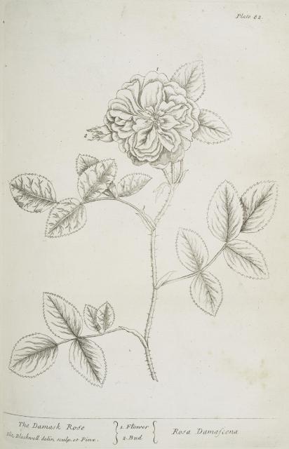 The text for this image is found on the page 081-084 Garden Radish, Damask Rose, Pease, Hedge Nettle in A Curious Herbal, Elizabeth Blackwell, 1737 (Vol. 1), 1739 (Vol. 2).