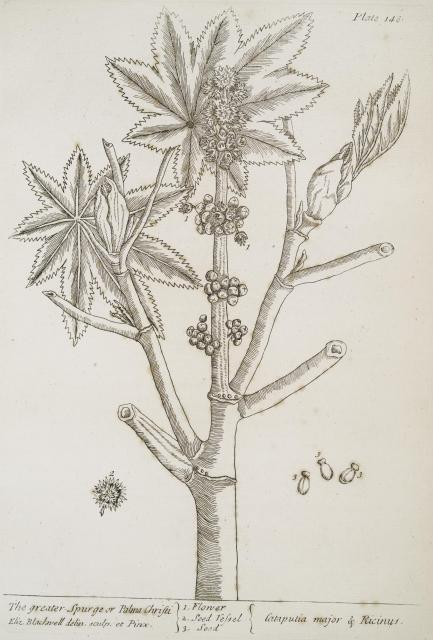 The text for this image is found on the page 145-148 Pomgranates, Tobacco, Sow-bread, greater Spurge in A Curious Herbal, Elizabeth Blackwell, 1737 (Vol. 1), 1739 (Vol. 2).