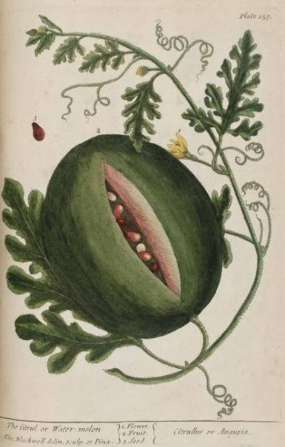 The text for this image is found on the page 157-160 Citrul, Wild Iris, Rosemary, Flax in A Curious Herbal, Elizabeth Blackwell, 1737 (Vol. 1), 1739 (Vol. 2).
