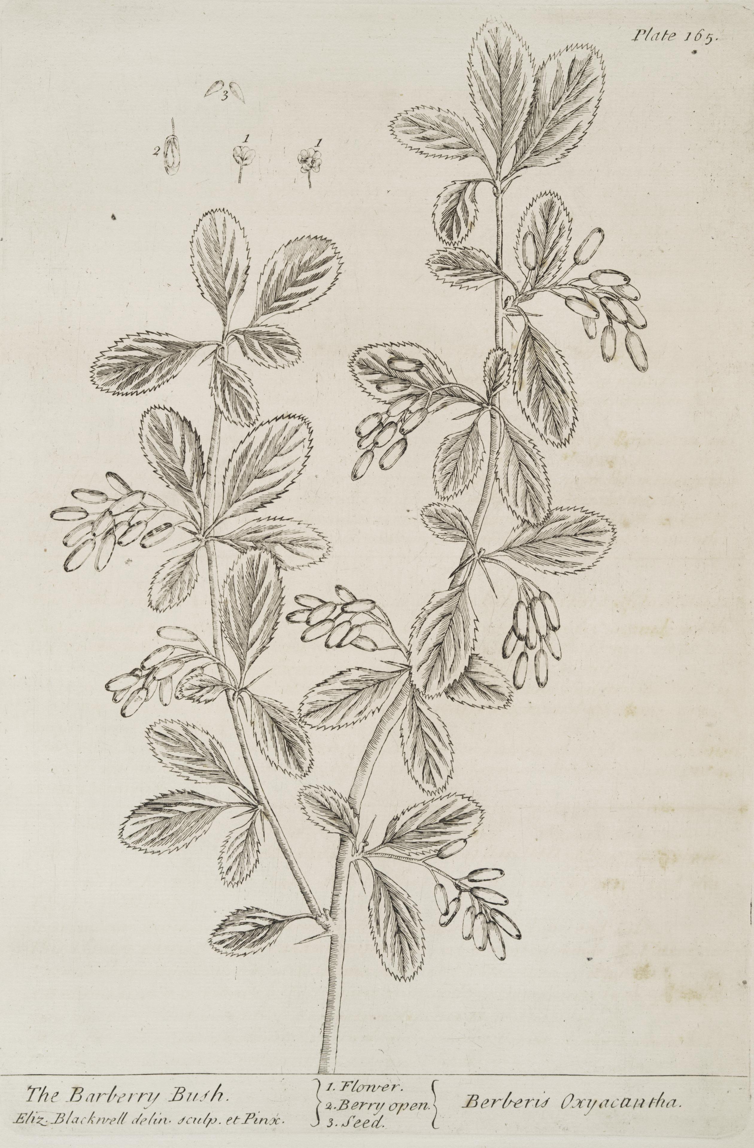 The text for this image is found on the page 165-168 The Barberry Bush, Mountain Calamint, The Common Calamint, White Ladies-Bed-Straw in A Curious Herbal, Elizabeth Blackwell, 1737 (Vol. 1), 1739 (Vol. 2).