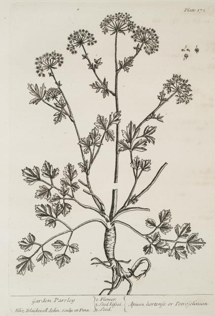 The text for this image is found on the page 169-172 Golden Rod, Fluellin, Motherwort, Garden Parsly in A Curious Herbal, Elizabeth Blackwell, 1737 (Vol. 1), 1739 (Vol. 2).