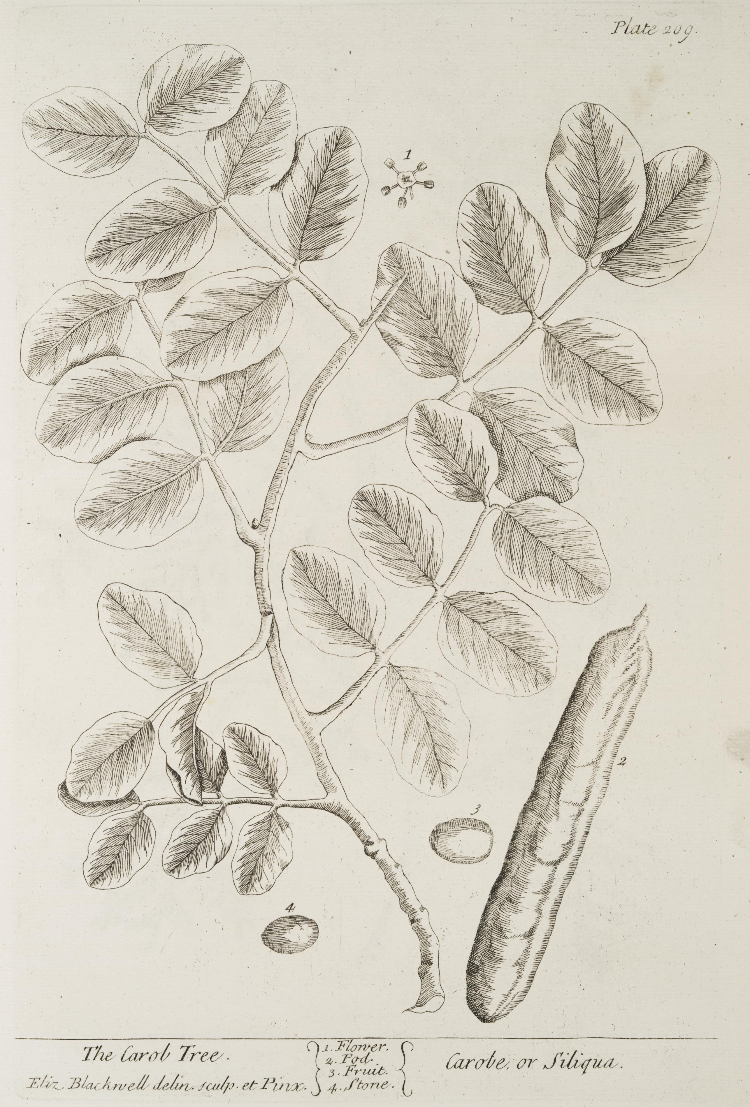 The text for this image is found on the page 209-212 The Carob Tree, The Tree of Life, Thyme, Rue-leaved Whitlow Grass in A Curious Herbal, Elizabeth Blackwell, 1737 (Vol. 1), 1739 (Vol. 2).
