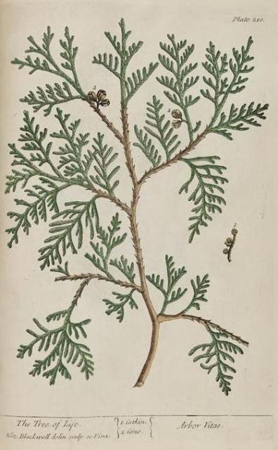 The text for this image is found on the page 209-212 The Carob Tree, The Tree of Life, Thyme, Rue-leaved Whitlow Grass in A Curious Herbal, Elizabeth Blackwell, 1737 (Vol. 1), 1739 (Vol. 2).