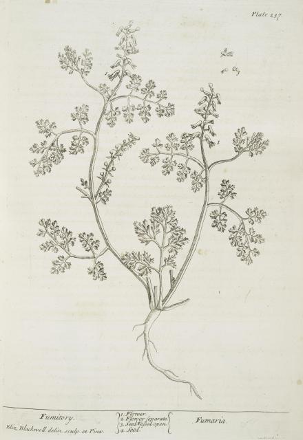 The text for this image is found on the page 237-240 Fumitory, the true white Asphodel, Great Woolf's-bane, Birch in A Curious Herbal, Elizabeth Blackwell, 1737 (Vol. 1), 1739 (Vol. 2).