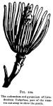 The stamens are numerous. The natural number, we believe, is six, opposite each petal, or thirty-six in all, and although that is the usual number, they vary by suppression from thirty-two to thirty-six. They are an inch and a quarter long and consist each of a firm filament, one-third the length of the stamen, and of two long shallow anther-cells attached parallel to the outside of the broad filament (extrorsely adnate) [The stamens of Liriodendron being ertrorse, present a generic difference between this genus and Magnolia which has stamens all introrse.] and about two-thirds the length of the stamen, as shown in our cut (fig. 109).