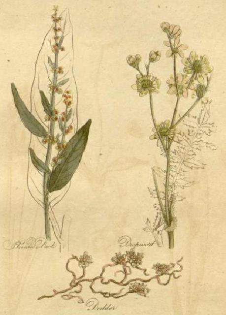 This image illustrates Pointed Dock, Dodder, and Dropwort, in The Family Herbal, John Hill, 1812.