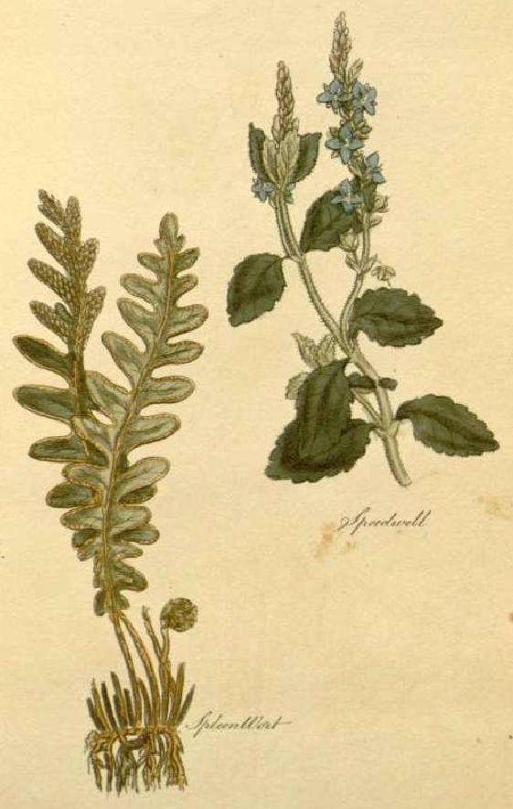 This image illustrates Speedwell and Spleenwort, in The Family Herbal, John Hill, 1812.