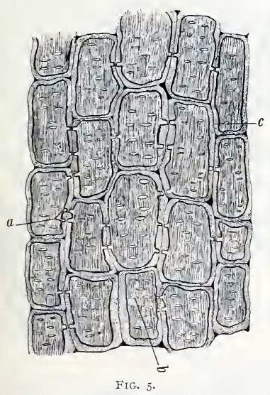b, pits in parenchyma cells face view, longitudinal section of cells;