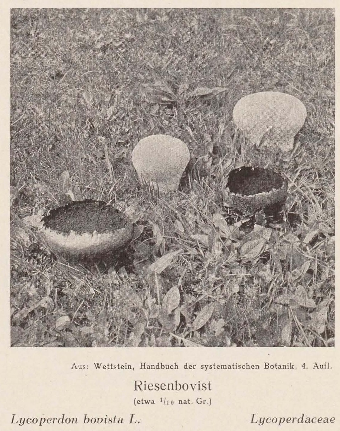 Lycoperdon bovista L. Lycoperdaceae. Aus: WEttstein, Handbuch der systematischen Botanik, 4. Aufl.