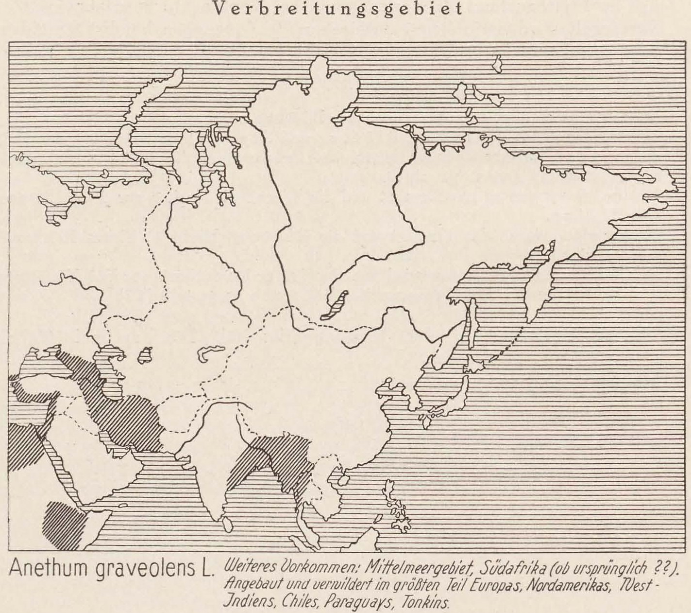 Verbreitungsgebiet: Anethum graveolens L. Weiteres Vorkommen: Mittelmeergebiet, Südafrika (ob ursprünglich ??). Angebaut und verwildert im grössten Teil Europas, Nordamerikas, Westindiens, Chiles, Paraguays, Tonkins.