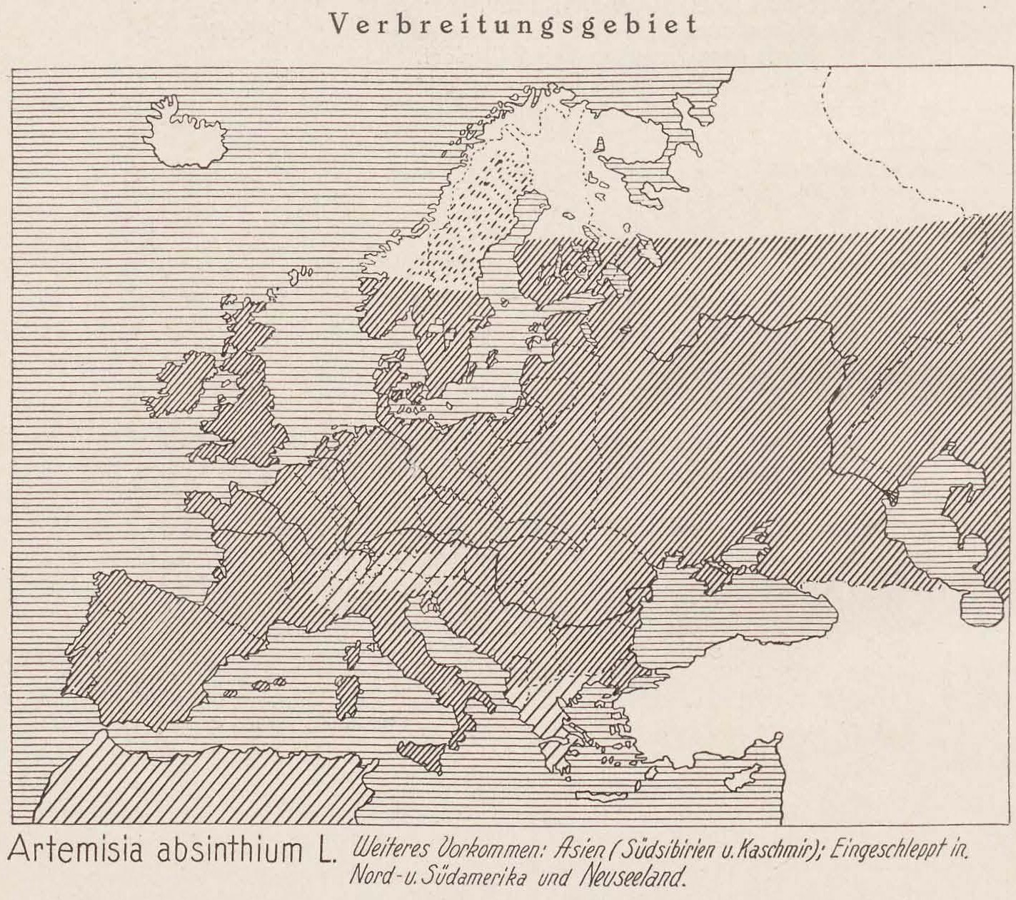 Verbreitungsgebiet: Artemisia absinthium L. Weiteres Vorkommen: Asien (Südsibirien u. Kaschmir); Eingeschleppt in Nord- u. Südamerika und Neuseeland.
