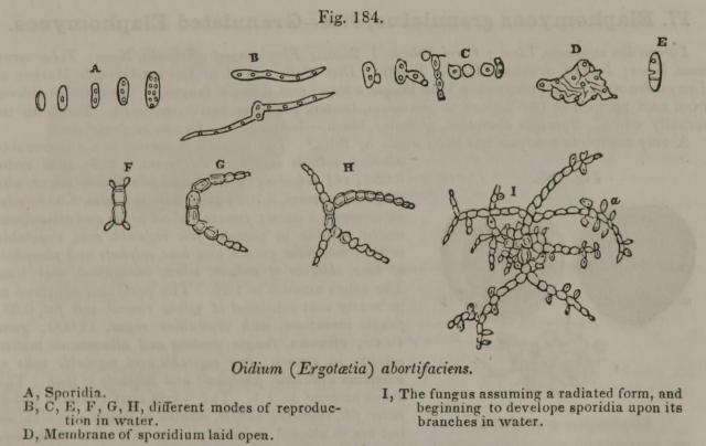 A, Sporidia. B, C, E, F, G, H, different modes of reproduction in water. D, Membrane of sporidium laid open. I, the fungus assuming a radiated form, and beginning to develope sporidia upon its branches in water.