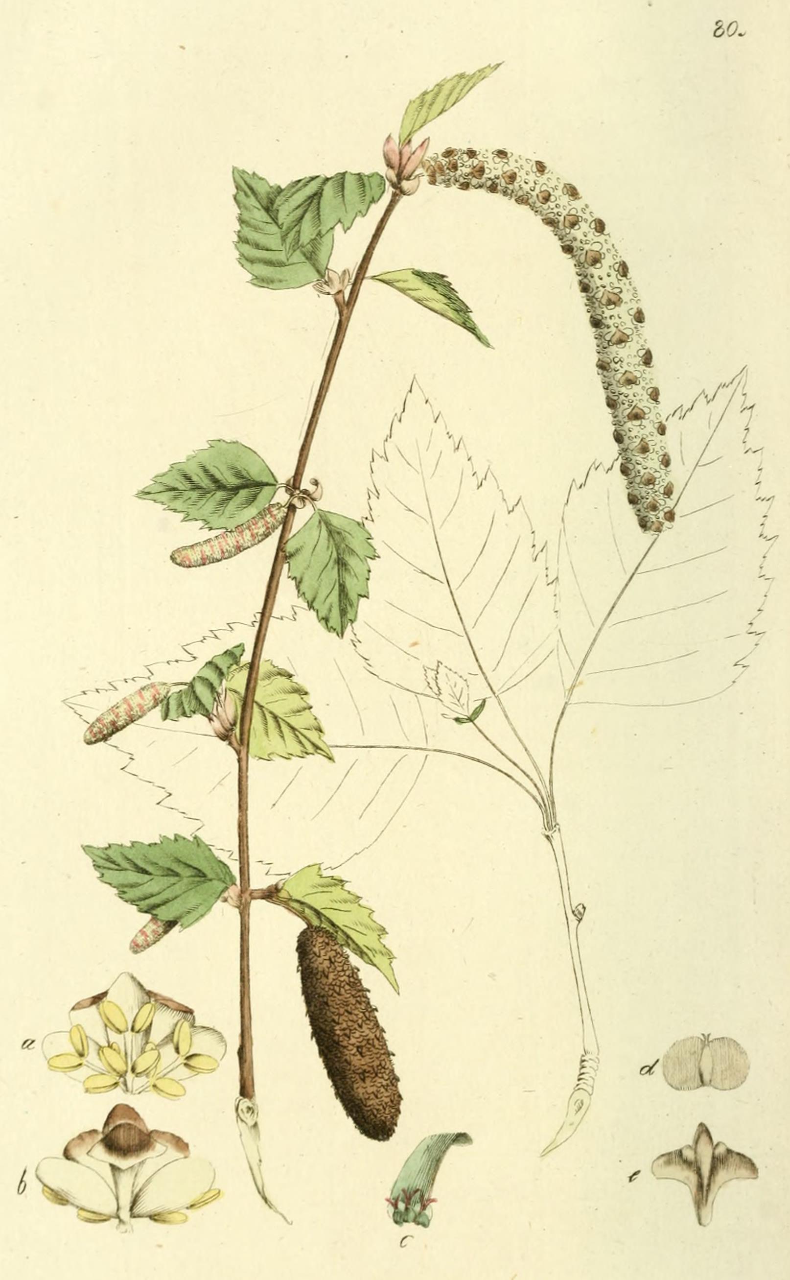 Denna bild är från boken Svensk Botanik, band 2, 1803, sida Betula alba.