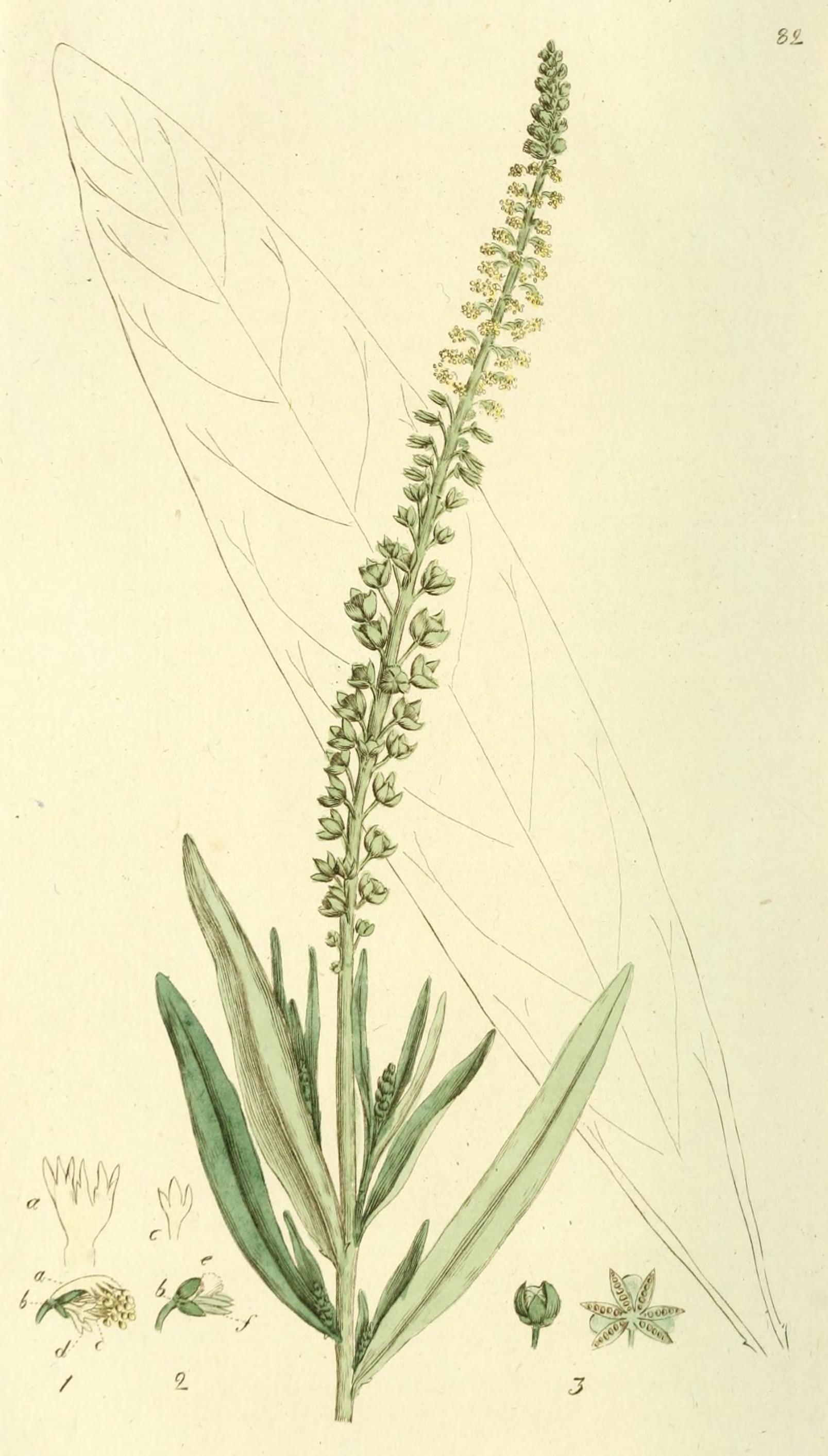 Denna bild är från boken Svensk Botanik, band 2, 1803, sida Reseda luteola.