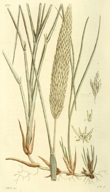 Denna bild är från boken Svensk Botanik, band 2, 1803, sida 138. Arundo arenaria.".