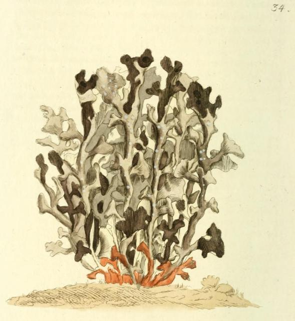 Denna bild är från boken Svensk Botanik, band 1, 1815, sida Cetraria islandica.