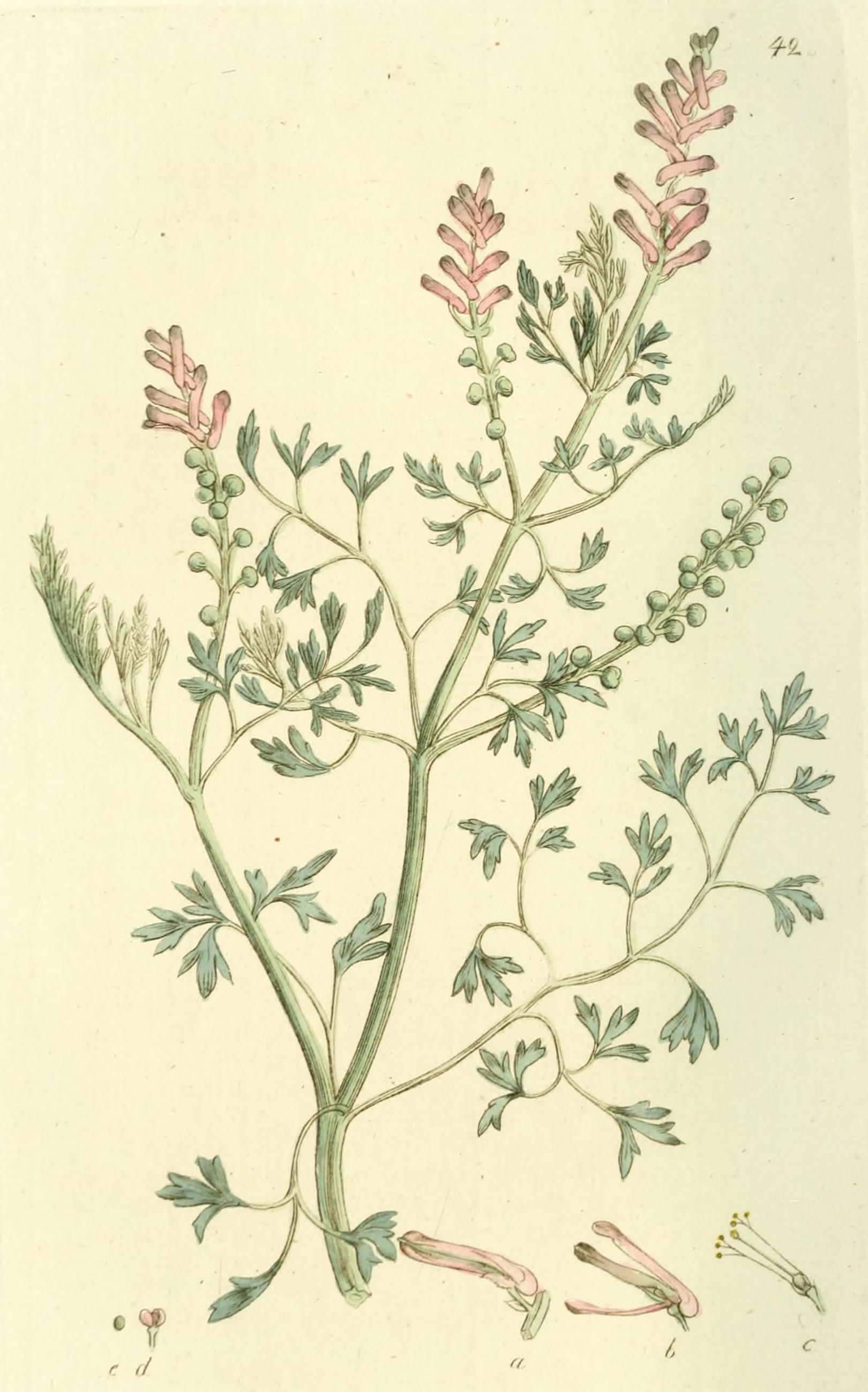 Denna bild är från boken Svensk Botanik, band 1, 1815, sida Fumaria officinalis.