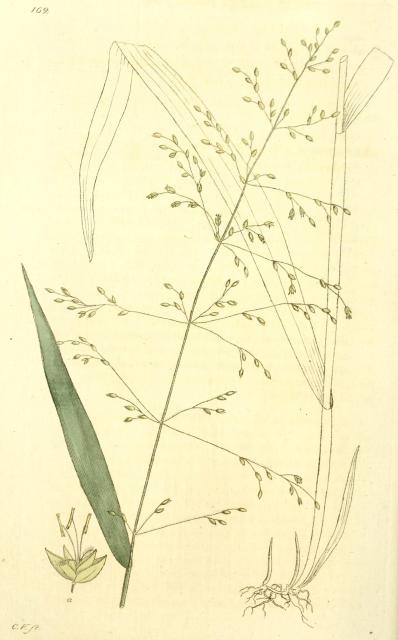 Denna bild är från boken Svensk Botanik, band 3, 1804, sida 162. Milium effusum.