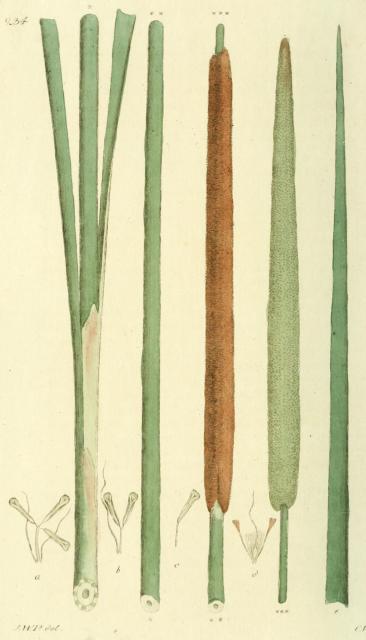 Denna bild är från boken Svensk Botanik, band 4, 1805, sida 234. Typha Angustifolia. Smalbladig Kasdun.