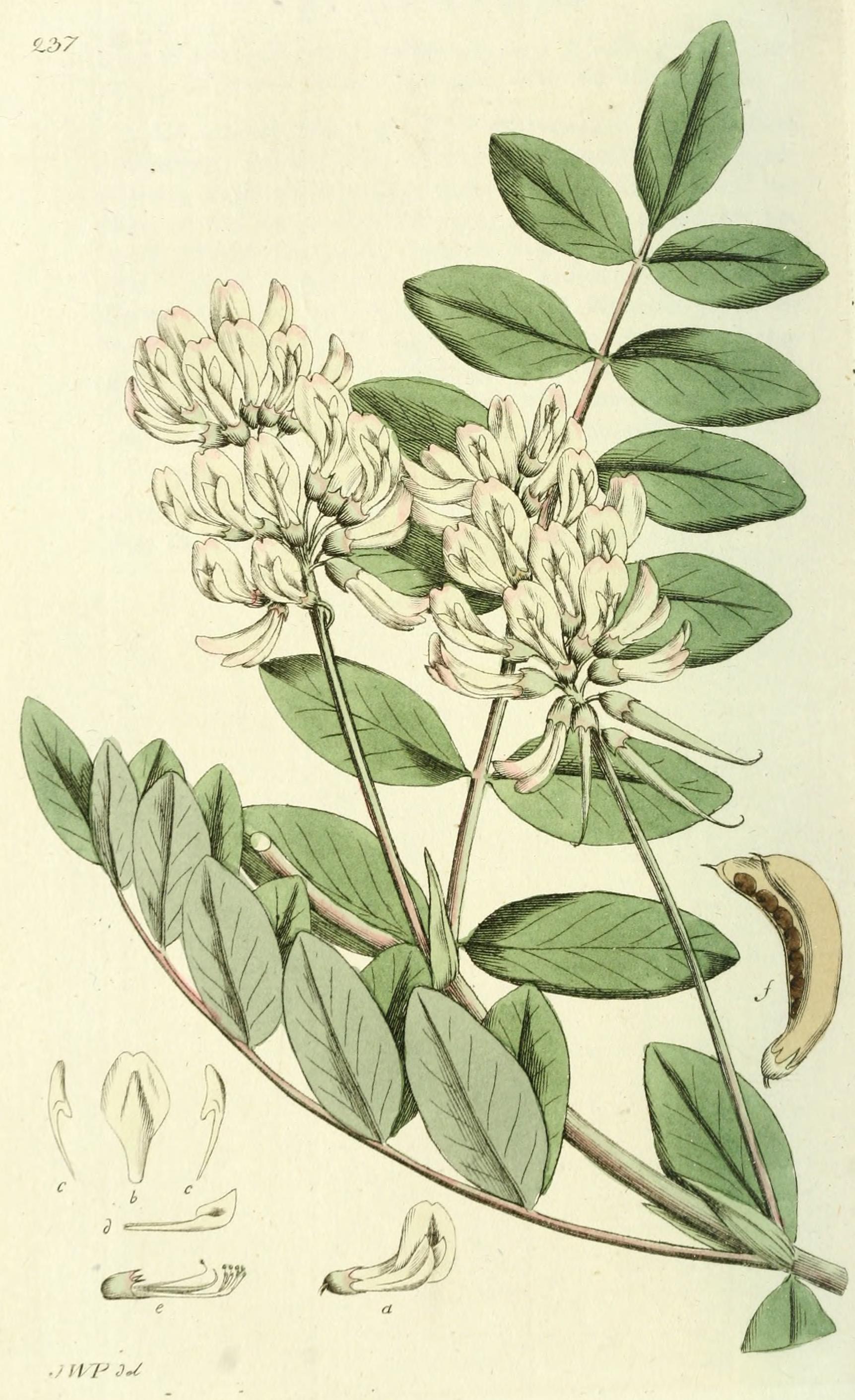 Denna bild är från boken Svensk Botanik, band 4, 1805, sida 237. Astragalus Glyciphyllus. Lakris-Astragal.