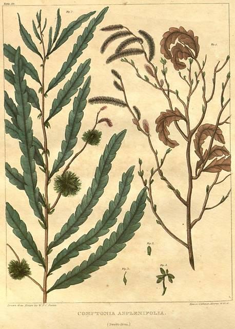 This image is from W. Barton's Vegetable Materia Medica, 1817 (Vol. I), 1818 (Vol. II), Comptonia.