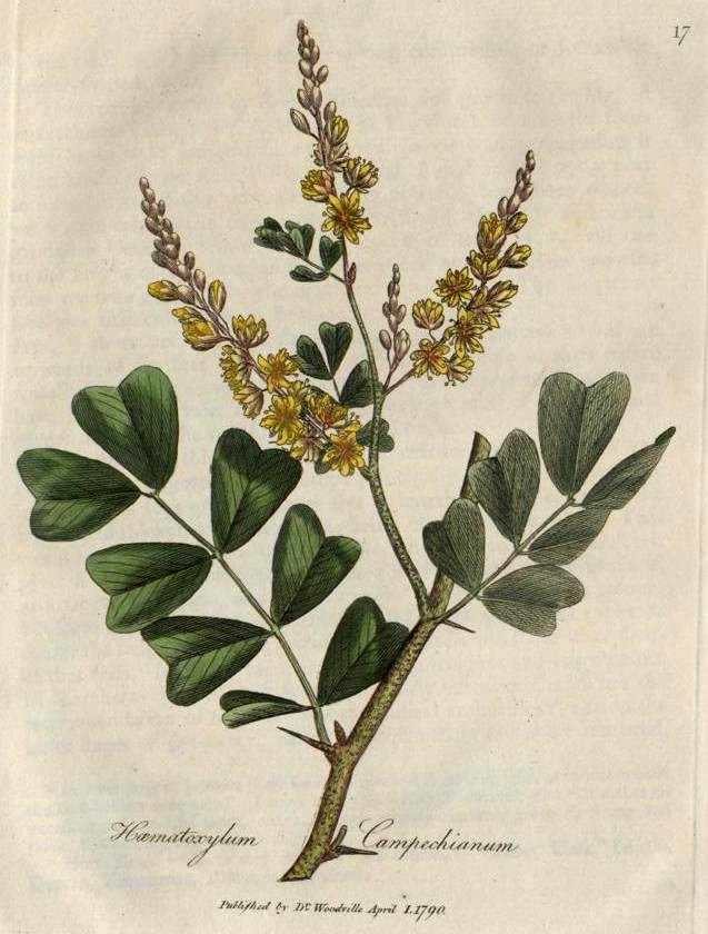 This image is from 017. Haematoxylum campechianum. Logwood. in Medical Botany, Woodville, 1790-1794.