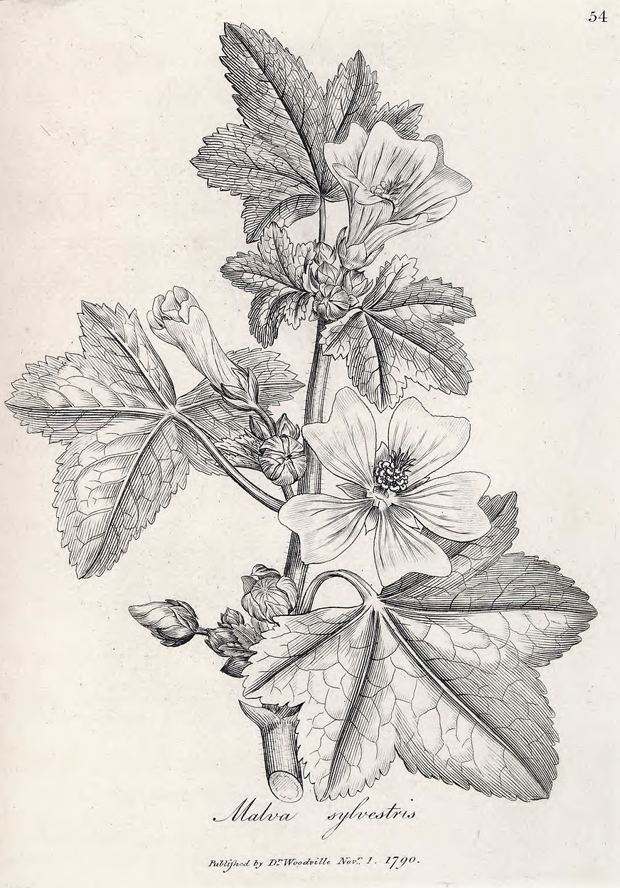 This image is from 054. Malva sylvestris. Common mallow. in Medical Botany, Woodville, 1790-1794.