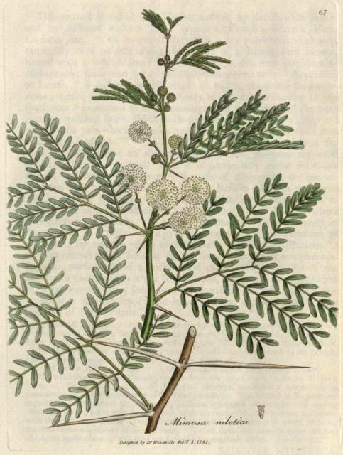 This image is from 067. Mimosa nilotica. Egyptian mimosa, Acacia, Egyptian thorn. in Medical Botany, Woodville, 1790-1794.