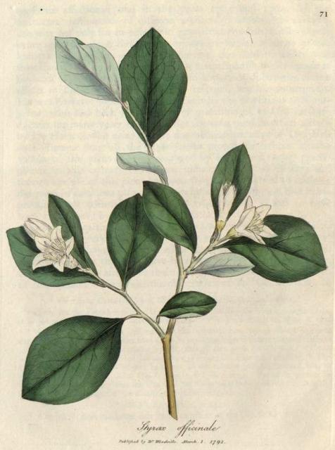 This image is from 071. Styrax officinale. Officinal Storax. in Medical Botany, Woodville, 1790-1794.