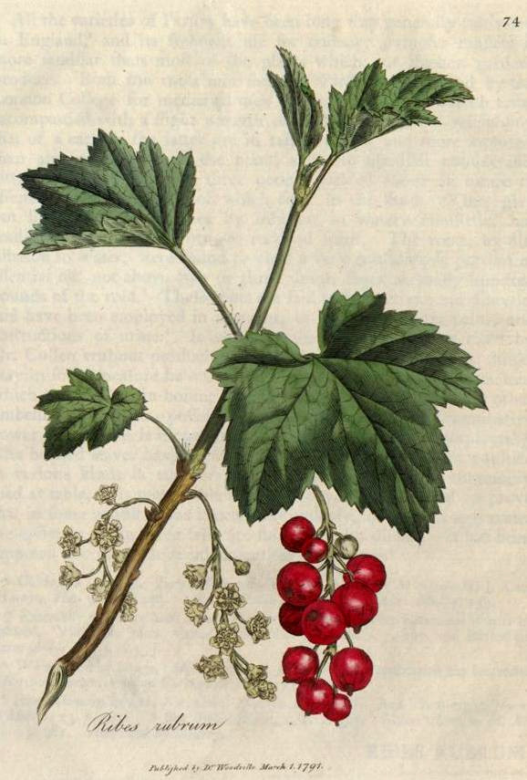 This image is from 074. Ribes rubrum. Red currant. in Medical Botany, Woodville, 1790-1794.