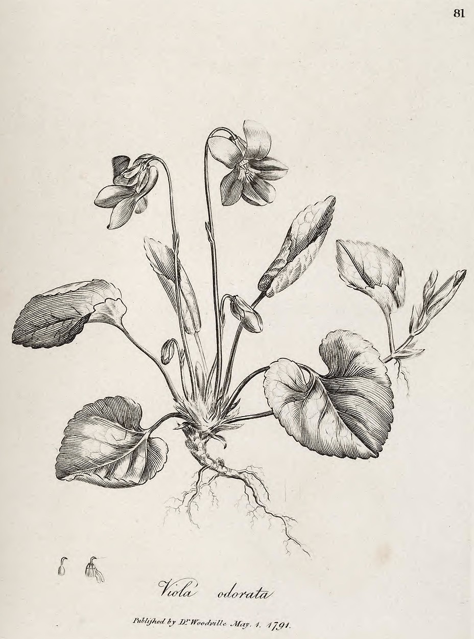 This image is from 081. Viola odorata. Sweet violet. in Medical Botany, Woodville, 1790-1794.