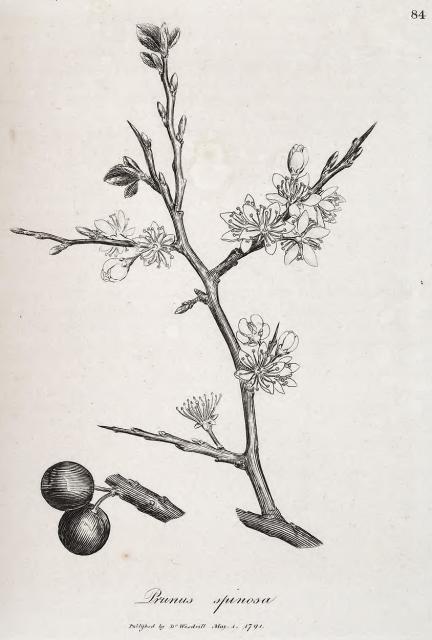 This image is from 084. Prunus spinosa. Sloe tree. in Medical Botany, Woodville, 1790-1794.