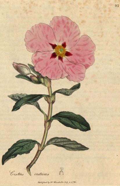 This image is from 091. Cistus creticus. Cretan cistus. in Medical Botany, Woodville, 1790-1794.