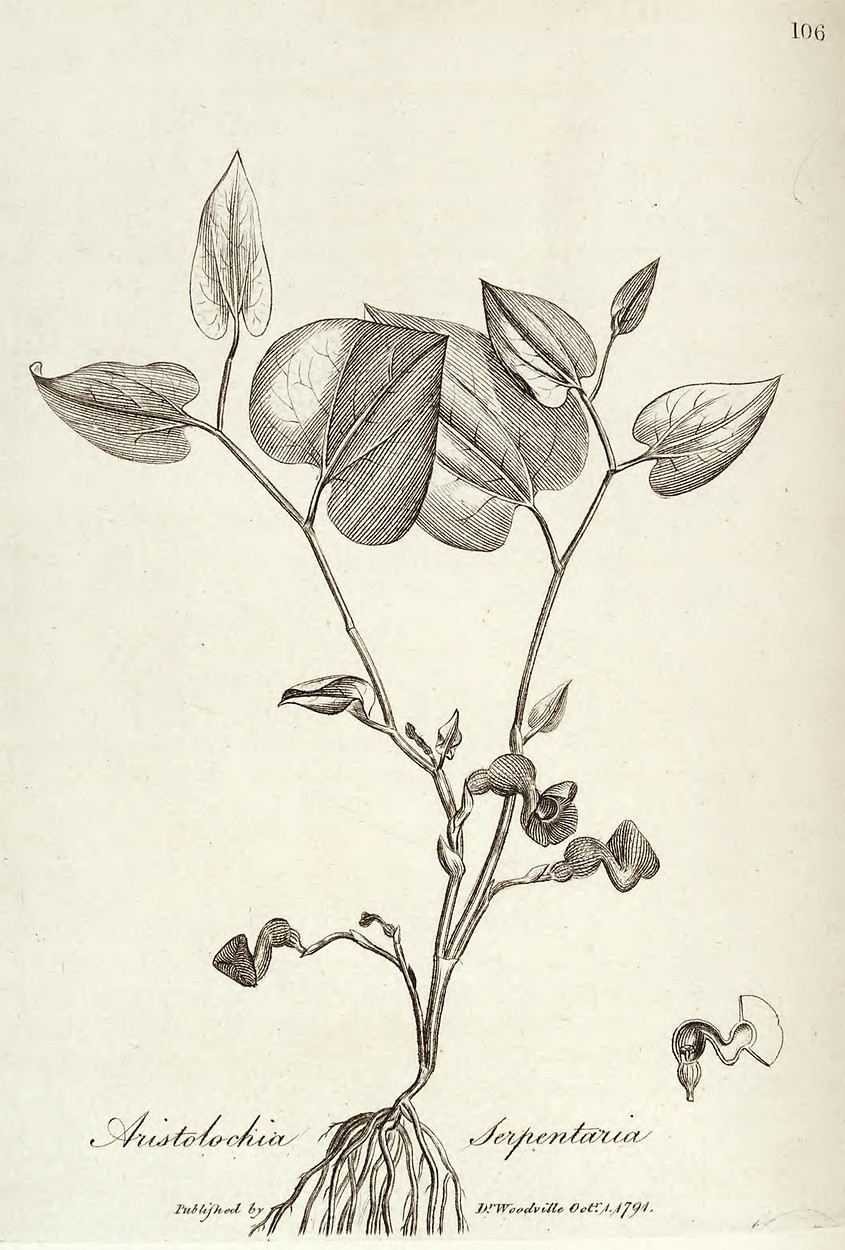 This image is from 106. Aristolochia serpentaria. Snake-root Birthwort. in Medical Botany, Woodville, 1790-1794.
