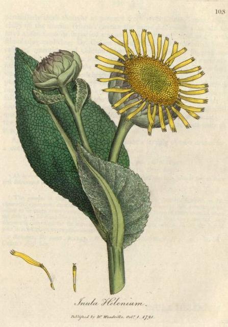 This image is from 108. Inula Helenium. Common Inula, or Elecampane. in Medical Botany, Woodville, 1790-1794.