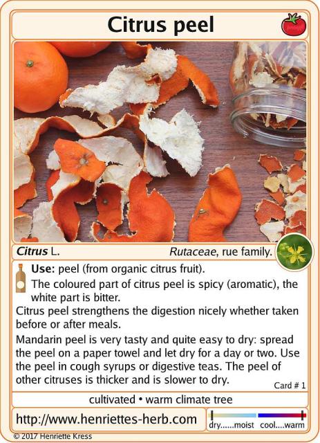 Gallery: Herb cardsRead more here. Henriette's herb cards: order yours here!The copyright information is here.. Book Navigation ‹ Herb Card 01.2017 back: Citrus Peel. up Herb card 02.2017, back: Citrus fruit. ›