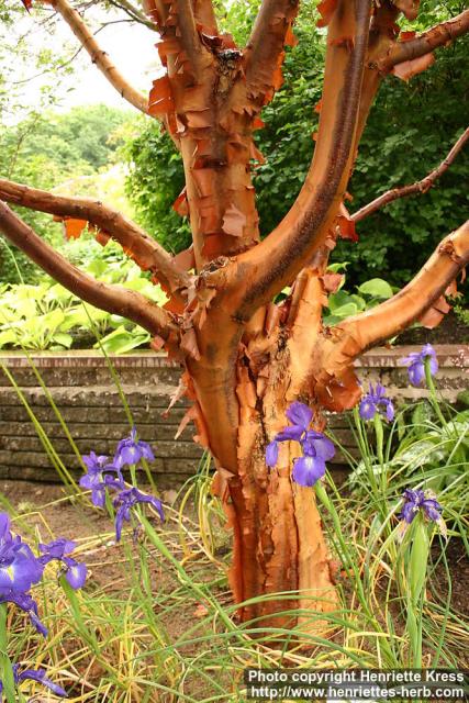 Trunk, especially stunning with those purple iris flowers against the coppery orange bark. Well done that gardener! Gothenburg bot.g., Sweden. Planted. 2007-07-12.