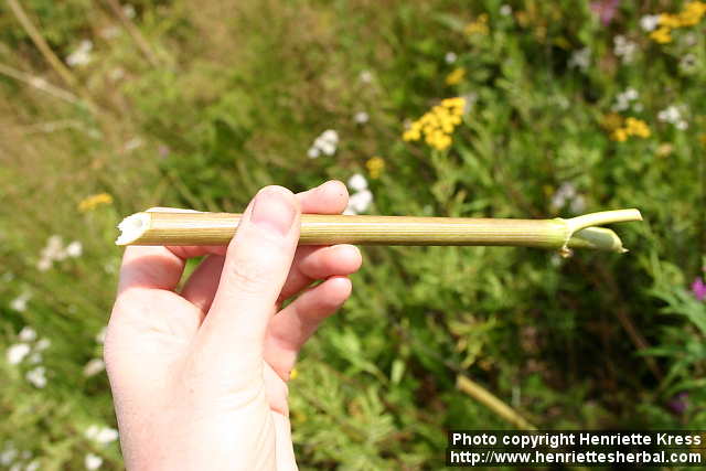 Making a whistling pipe: now your pipe is done. To use it: put the second cut against your mouth, pipe straight down, and blow. Wooooooooo... Ylästö, Vantaa, Finland. Picked. 2005-07-28.