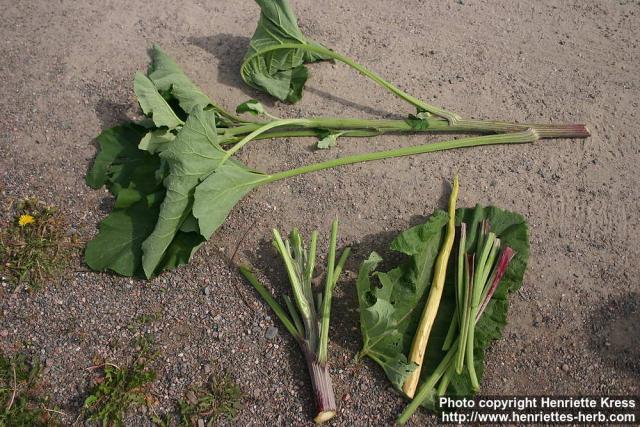 Flower stalk, de-leafed flower stalk, and peeled flower stalk with leaf stalks on leaf. Tapanila, Helsinki, Finland. Picked. 2010-06-09.