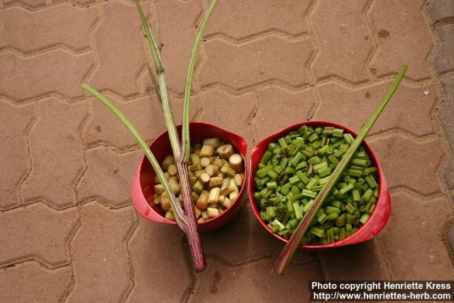 Flower stalk, peeled and cut up, and leaf stalks, cut up. Tapanila, Helsinki, Finland. Picked. 2010-06-09.