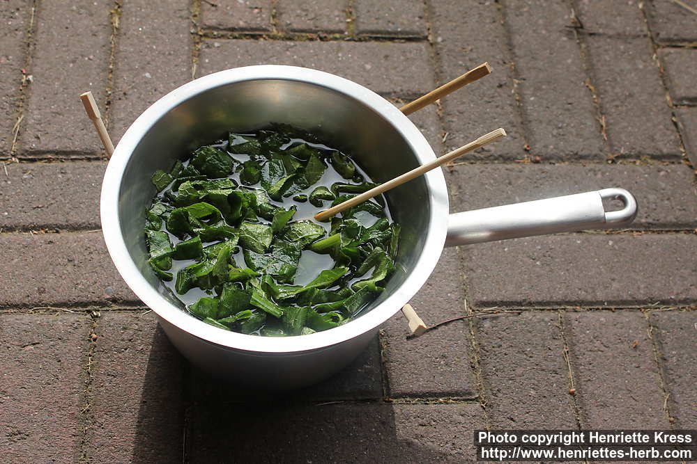 Leaf in oil on a waterbath (bain marie, double boiler). Tapanila, Helsinki, Finland. Processed. 2012-06-27.
