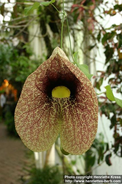 Deu.: Brasilianische Osterluzei, Vogelkopf-Pfeifenblume.