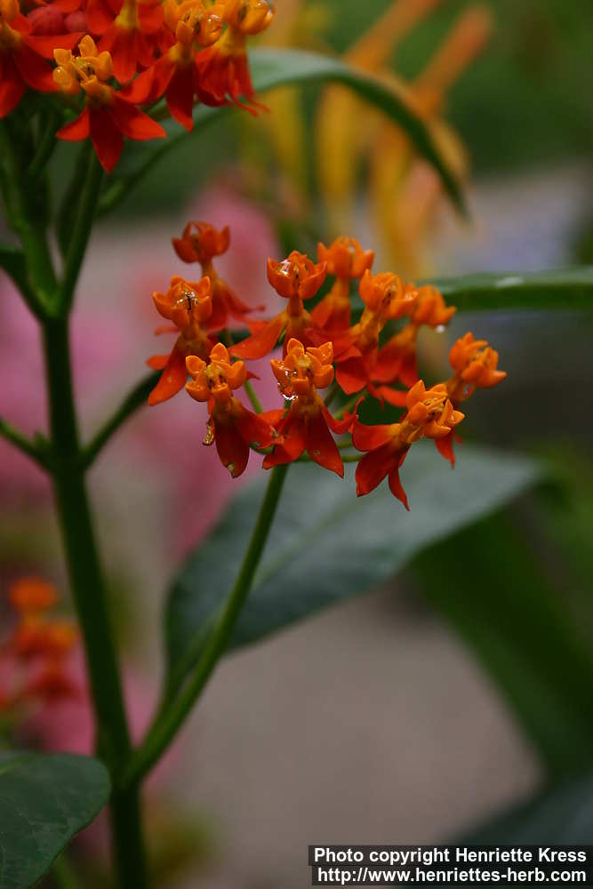 Engl.: blood flower, bastard ipecac, bastard ipecacuanha, blood-weed, bloodflower milkweed, butterfly weed, false ipecac, garden silkweed, Indian root, milkweed, redhead, scarlet milkweed, tropical milkweed, vegetable silk.