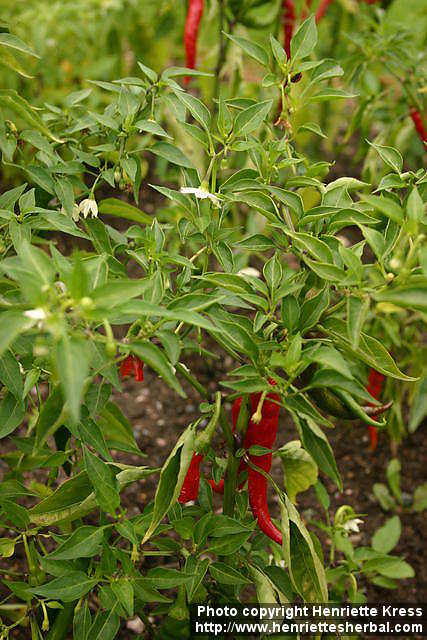 'Long Slim Cayenne'. Plants in flower and fruit. Botanical garden Kumpula, Helsinki, Finland. Planted. 2006-09-09.