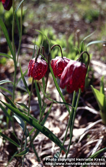 Engl.: common fritillary, fritillary, chequered daffodil, chequered lily, ginny flower, guinea flower, Guinea-hen flower, snake's head fritillary, turkey hen.